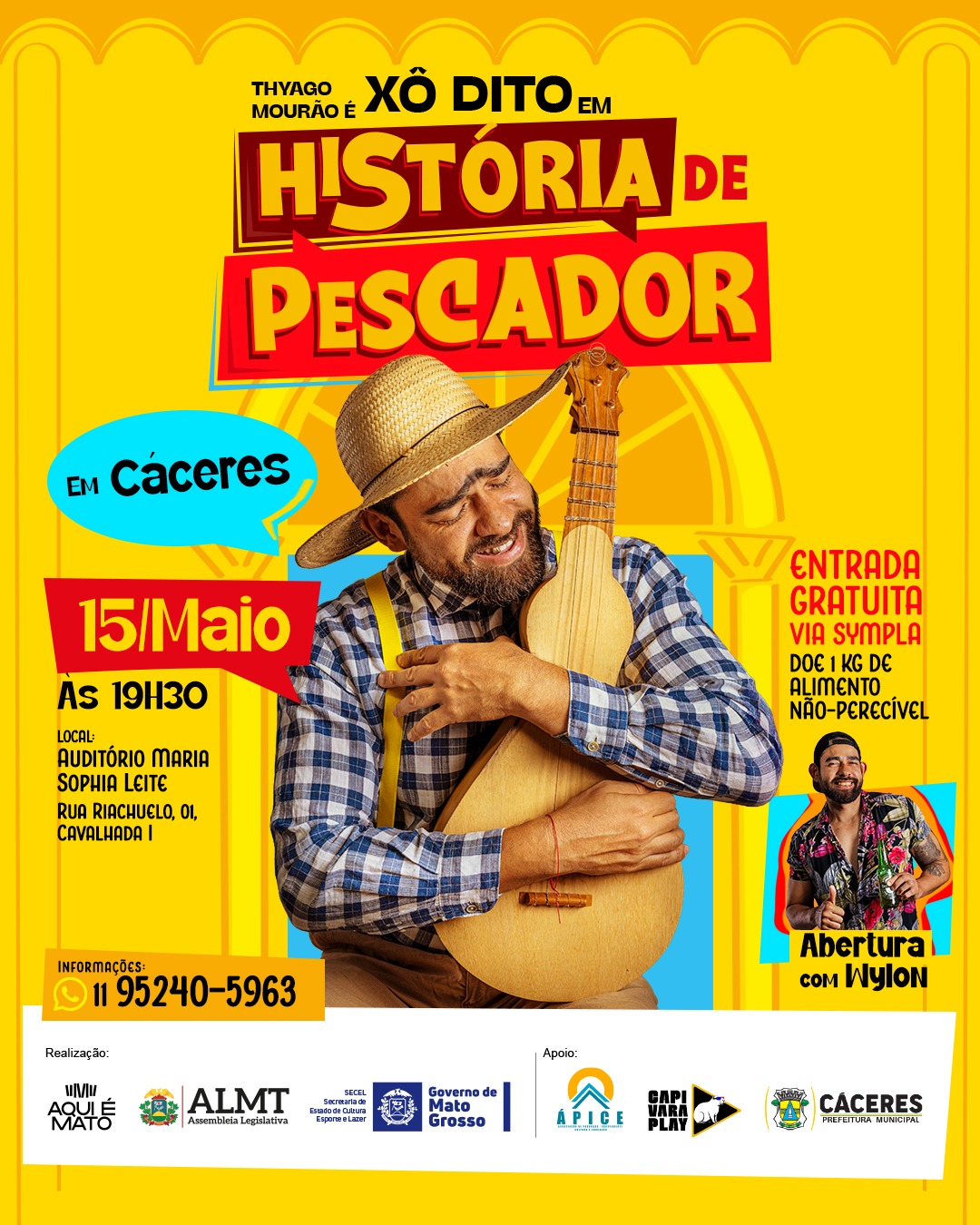 Cáceres recebe espetáculo “História de Pescador” com o humorista Thyago Mourão no dia 15 de maio