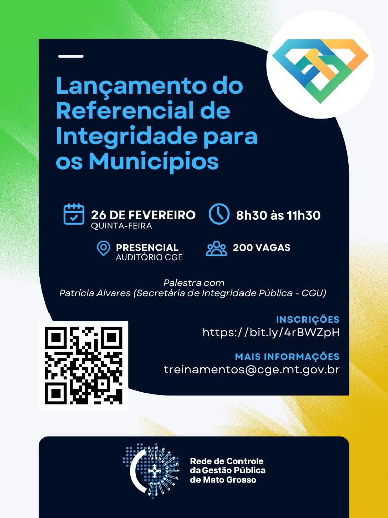 A Rede de Controle da Gestão Pública de Mato Grosso, que tem entre órgãos participantes a Controladoria-Geral do Estado (CGE) e a Procuradoria-Geral do Estado (PGE), abriu inscrições para o lançamento do Referencial Técnico para Implantação de Programas de Integridade nos municípios. O evento será realizado no dia 26 de fevereiro (quinta-feira), das 8h30 às 11h30, no auditório da CGE, no Centro Político Administrativo, em Cuiabá-MT.